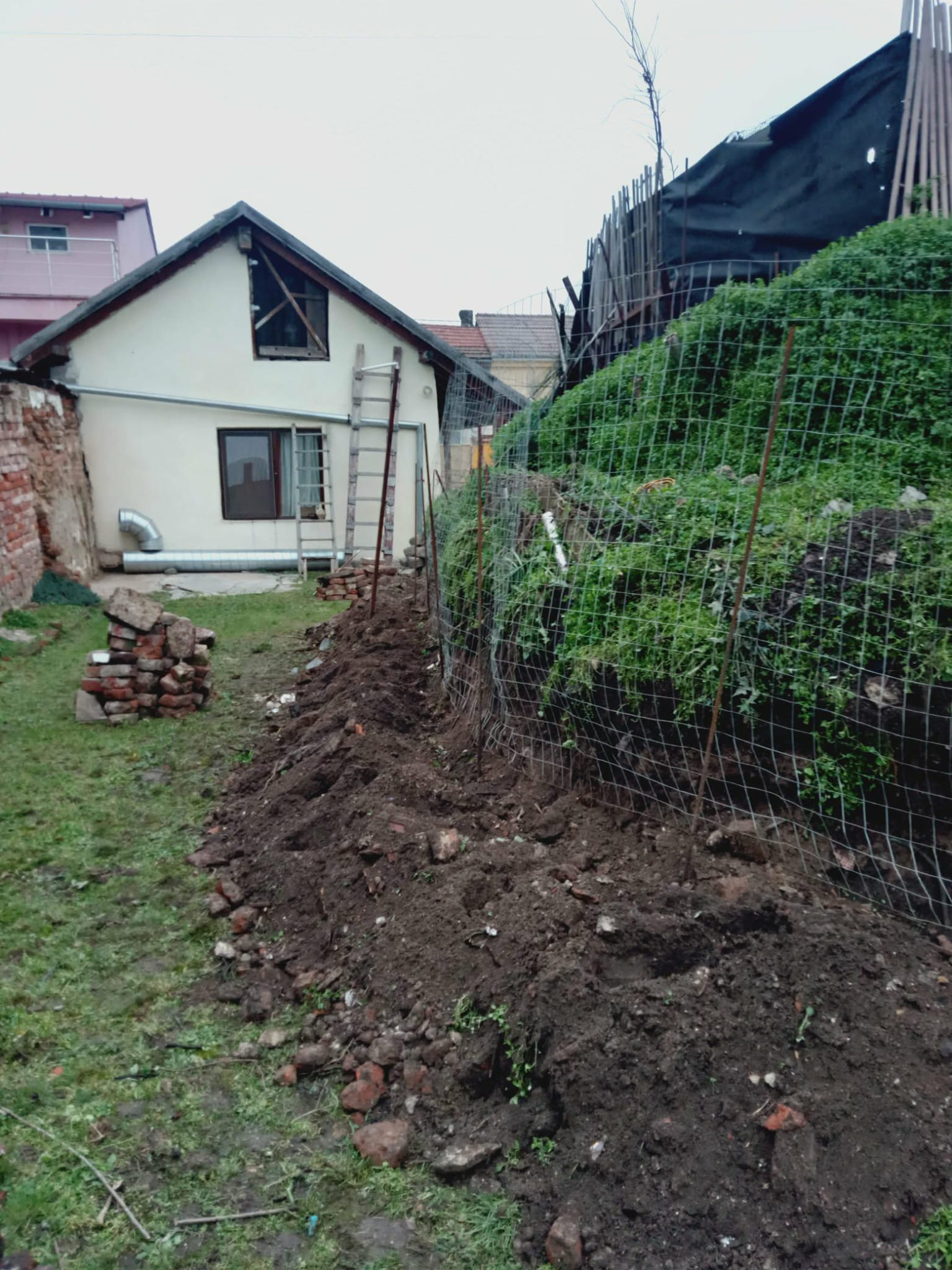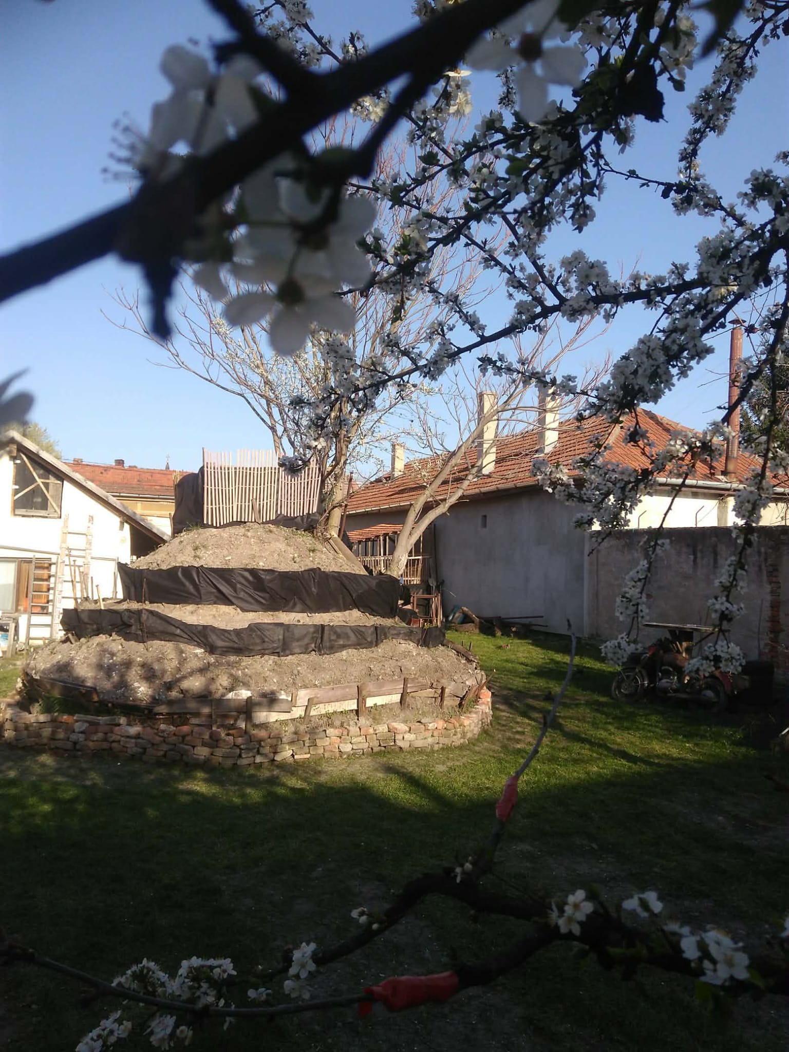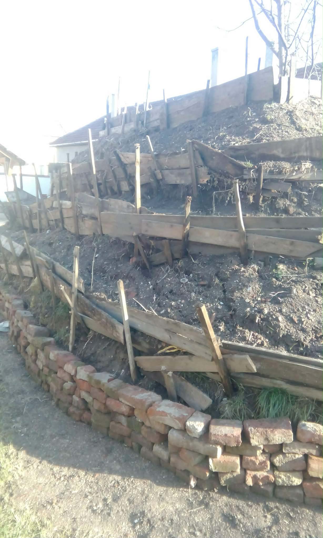 Manual, s-a început modelarea pământului cu lopata, fixat cu lemne și cărămizi din demolare.