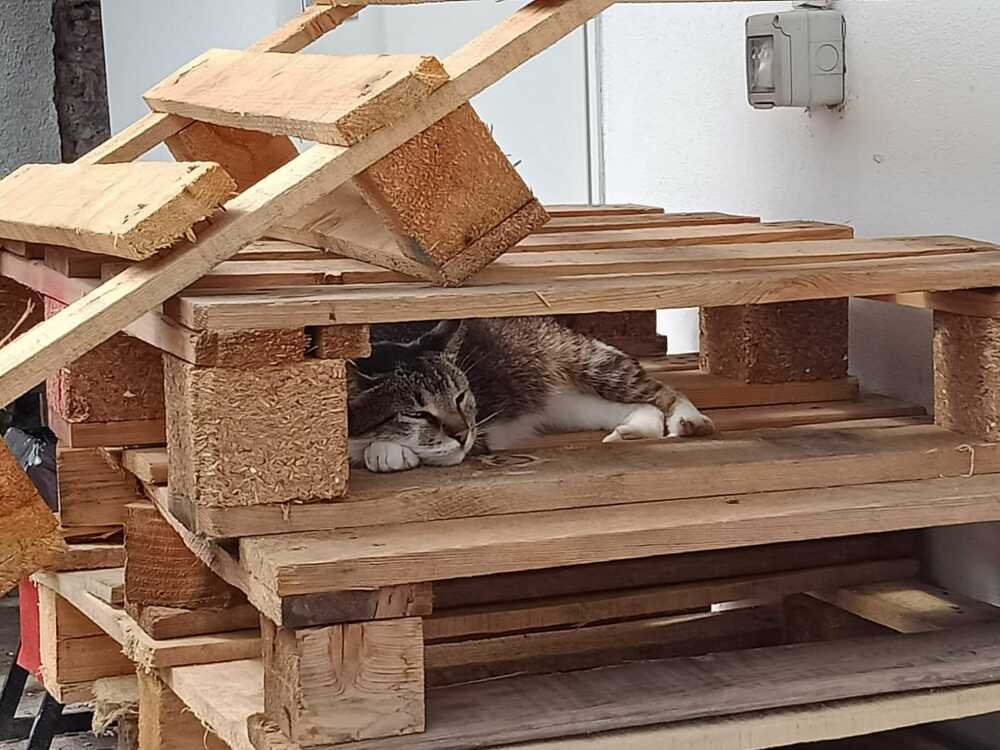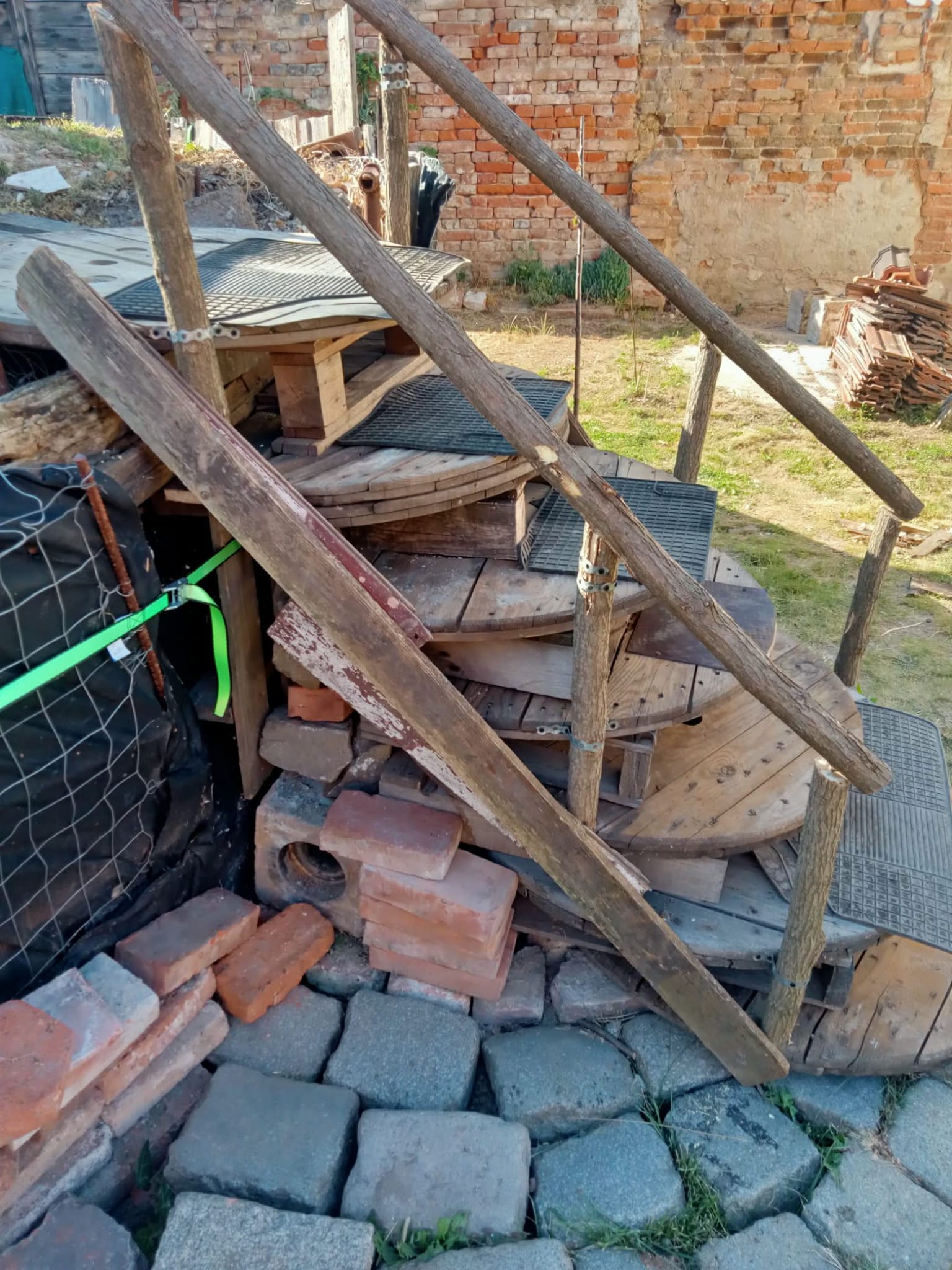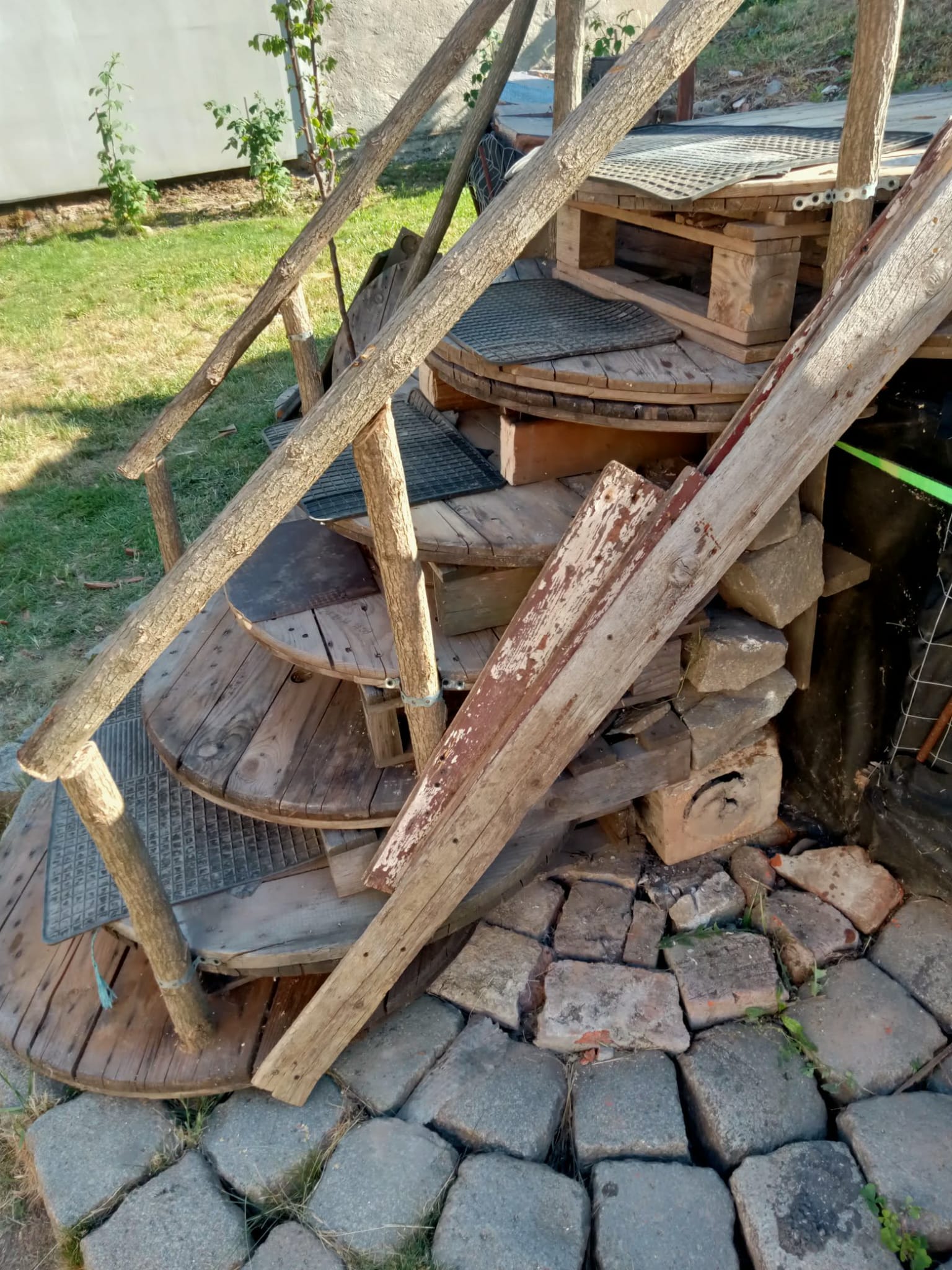Am avut parte și de ajutorul unei pisici (miau! :)) ), care mi-a dat ideea să fac scara din paleți și tamburi, susținută de piatră cubică. Pe parcursul proiectului au existat și mici accidentări, însă spray-urile WD-40 au fost salvatoare, menținând uneltele într-o stare impecabilă. Întreg procesul, până la finalizarea proiectului, a durat 4 ani!