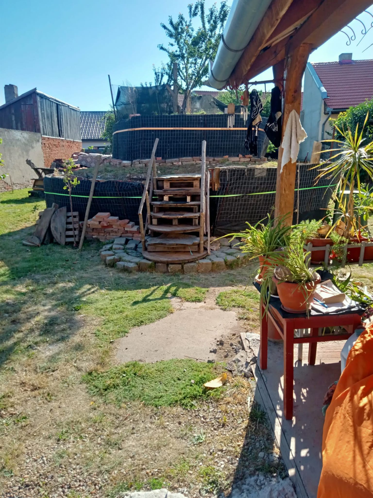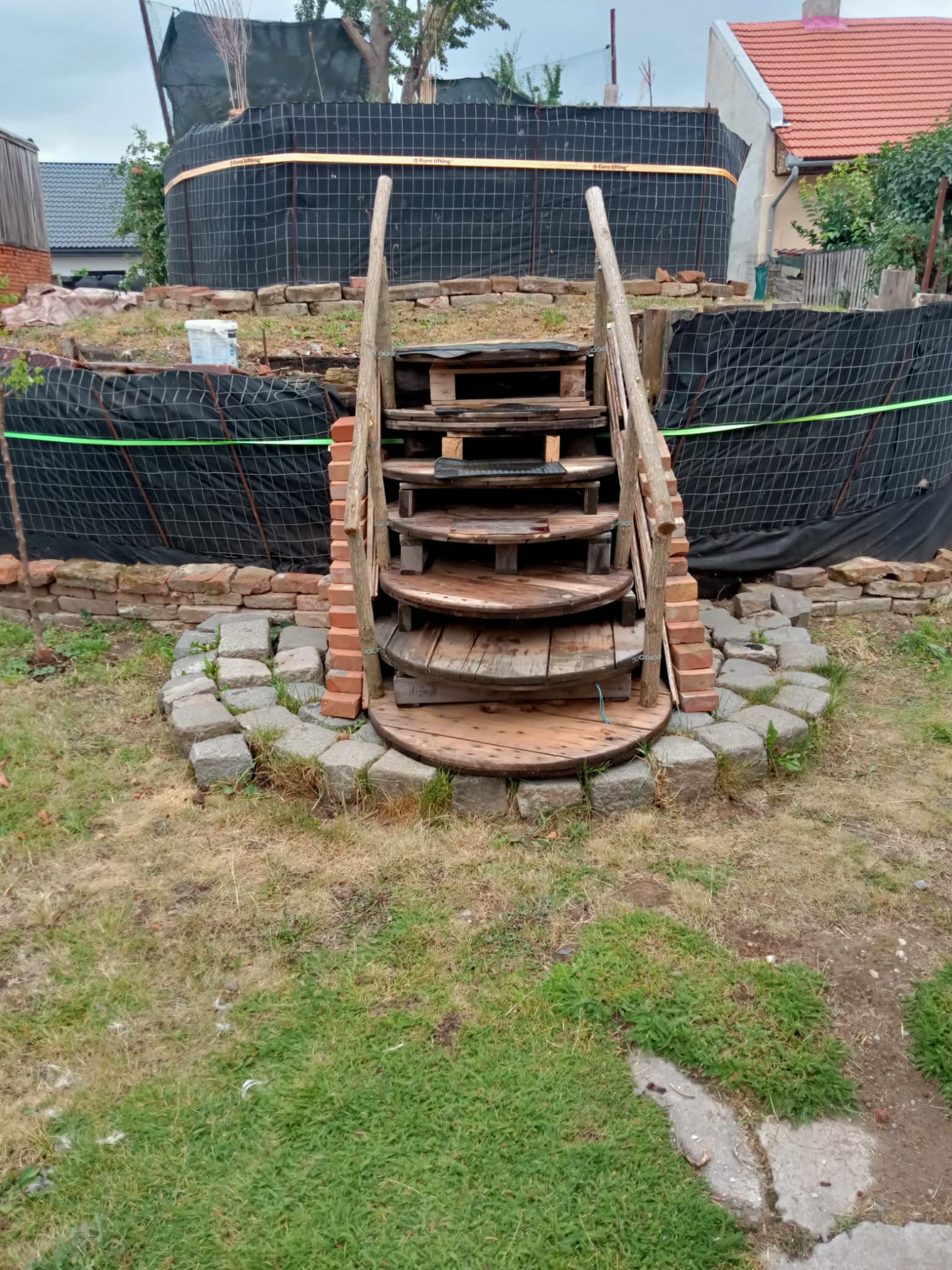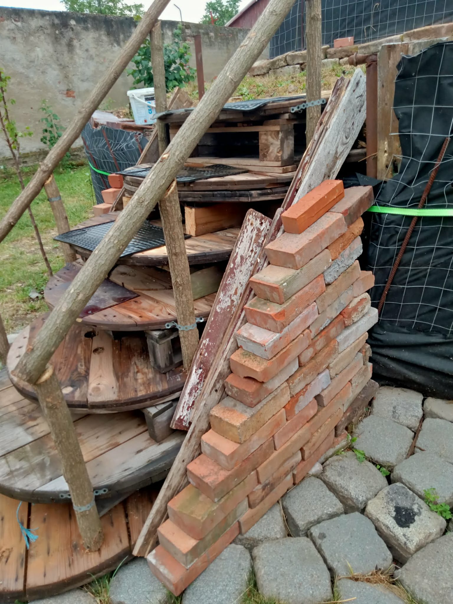 Am avut parte și de ajutorul unei pisici (miau! :)) ), care mi-a dat ideea să fac scara din paleți și tamburi, susținută de piatră cubică. Pe parcursul proiectului au existat și mici accidentări, însă spray-urile WD-40 au fost salvatoare, menținând uneltele într-o stare impecabilă. Întreg procesul, până la finalizarea proiectului, a durat 4 ani!
