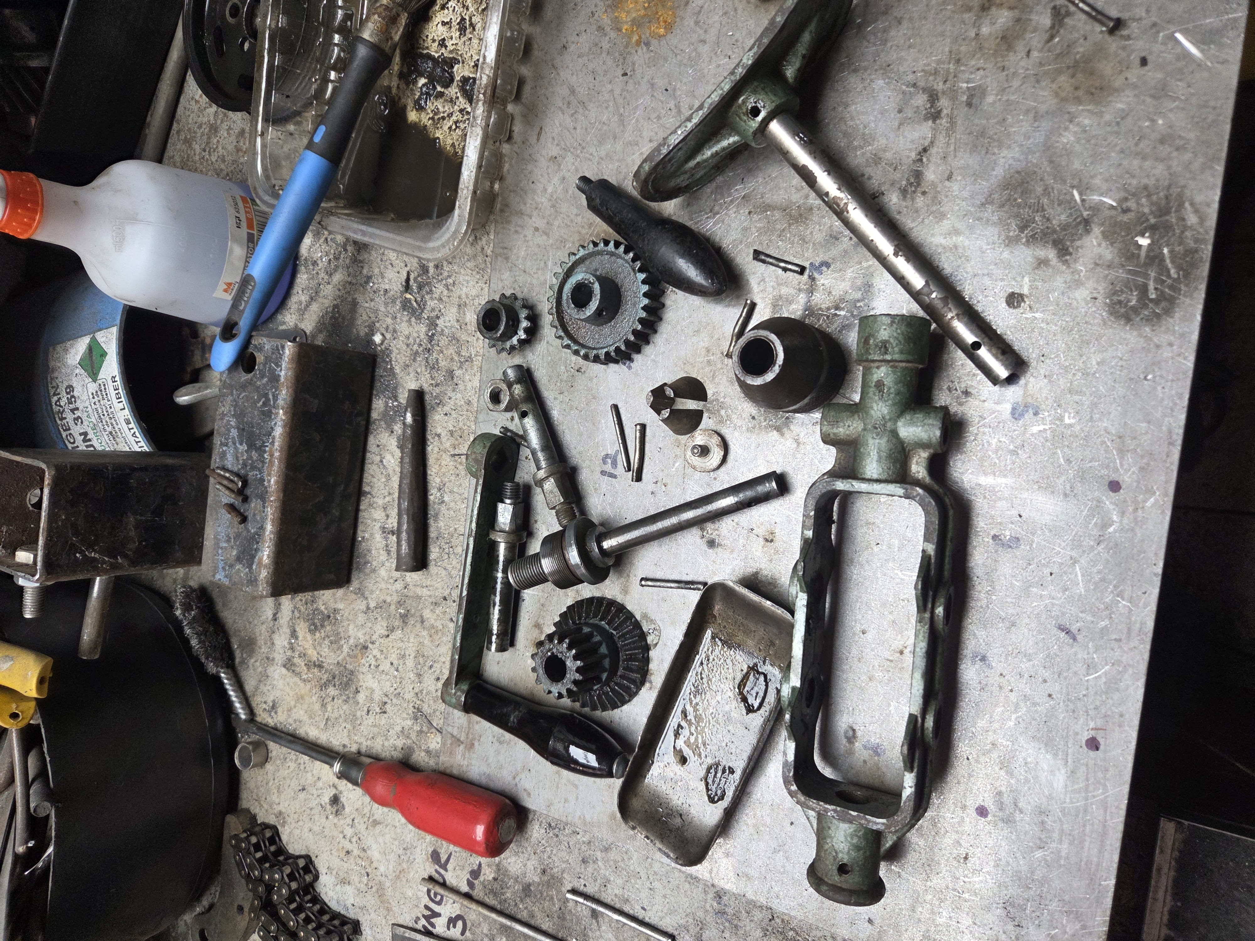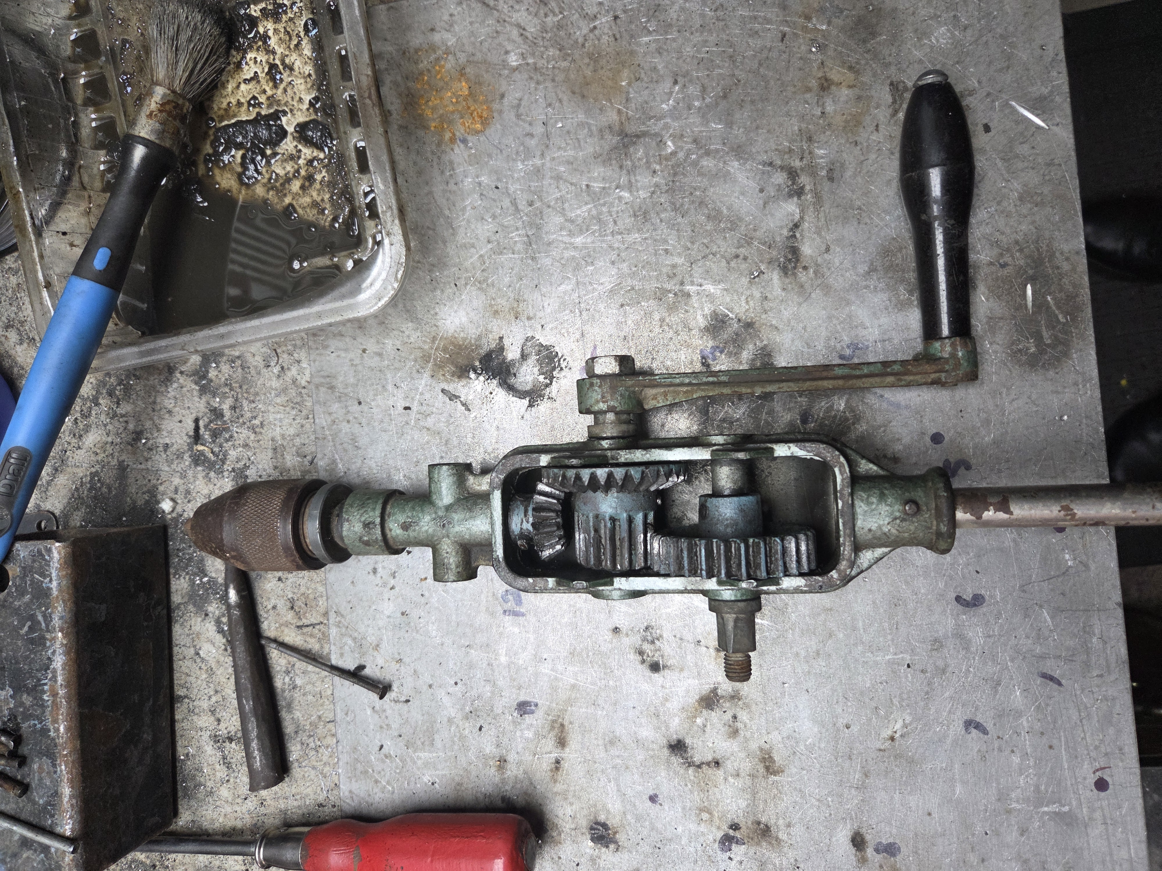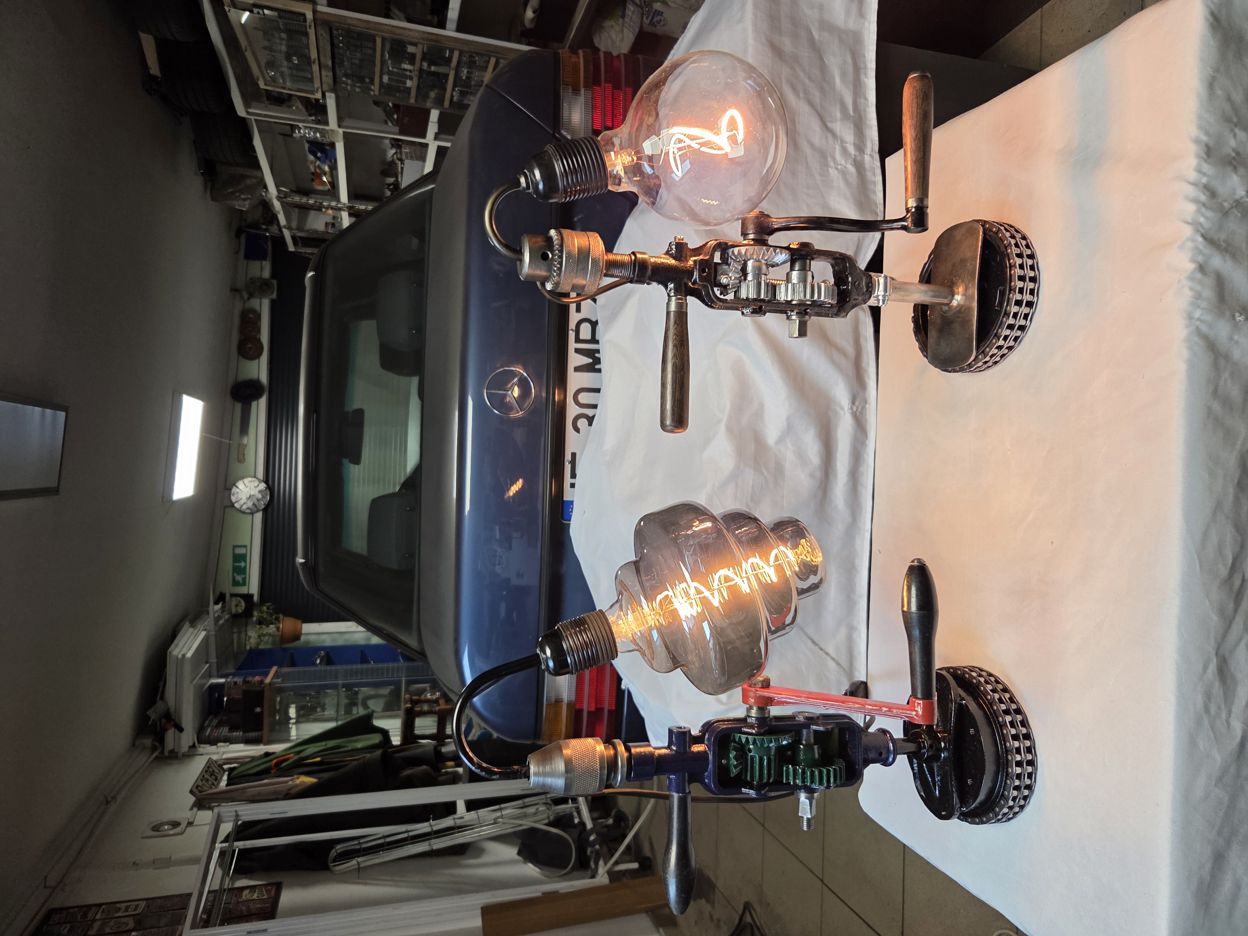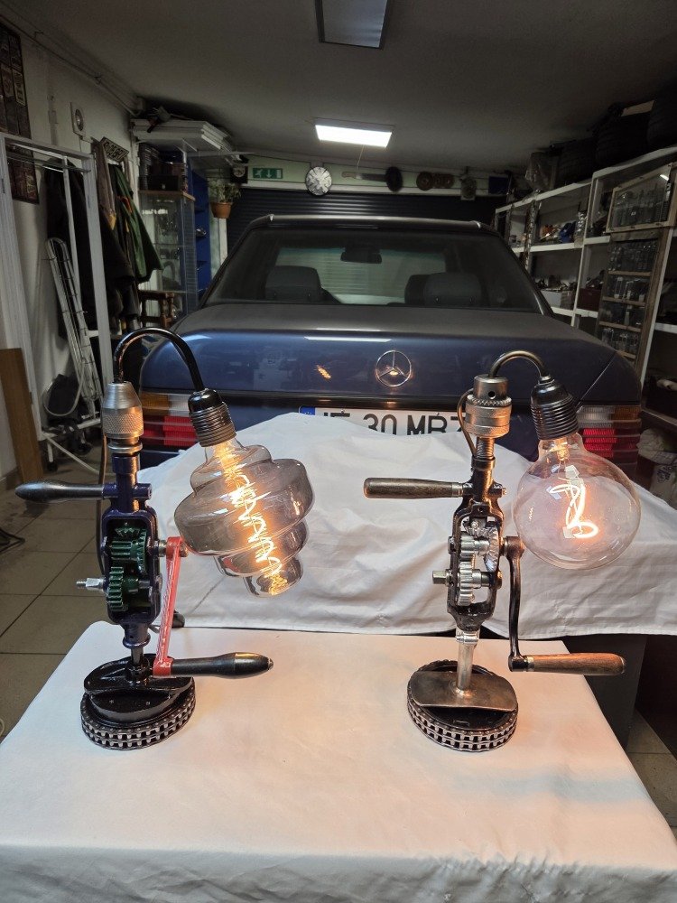 Acesta este ultimul meu proiect, doua masini de gaurit gasite la un centru de colectare a fierului vechi, curatate, vopsite si transformate in doua lampi de birou, din pacate nu am putut incarca si un video cu functionalitatea lor, becul poate fi rotit la 180 grade prin actionarea manivelei.