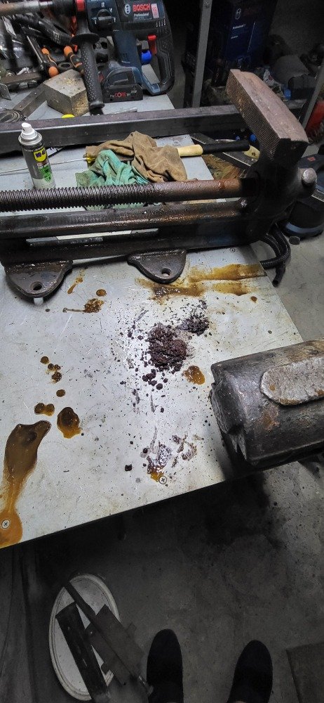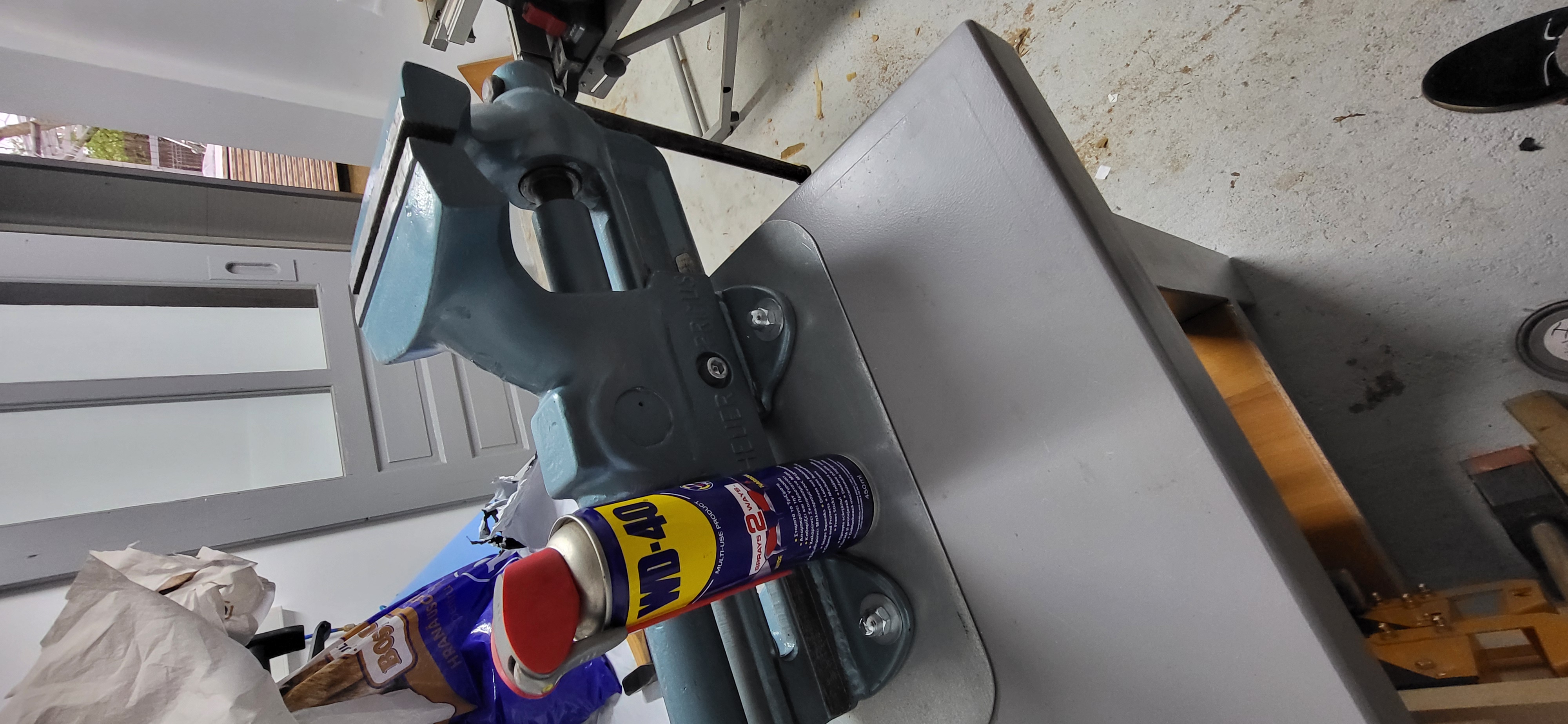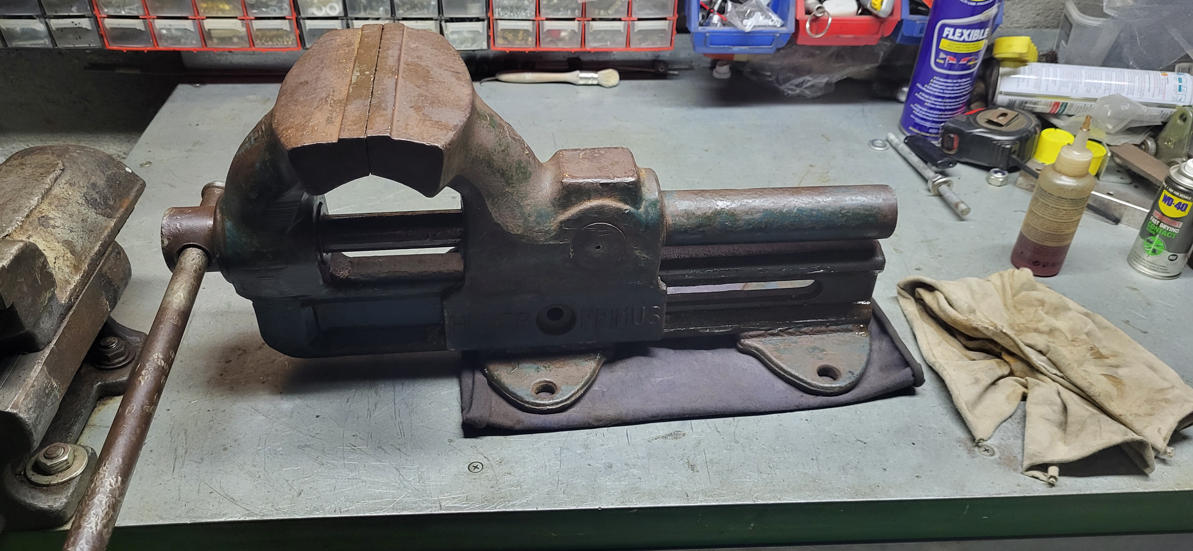 Am primit o menghină veche robustă de la un prieten,pe care a vrut să le ducă la fier vechi,pentru că a fost întepenit filetul principal cu manivelă!Se văd si în poze cătă rugină si murdărie s-a acumulat cu trecerea timpului.Dar cu ajutorul WD40 de mai multe tipuri(wd40 contact,wd40 universal) injectat lăngă ax în locasuri foarte mici si cu ajutorul unui arzător de faz am reusit să o desfac!Si pe urmă slefuire si vopsirea exterioară cum apare în ultina poză pridusul final functionează perfect!!